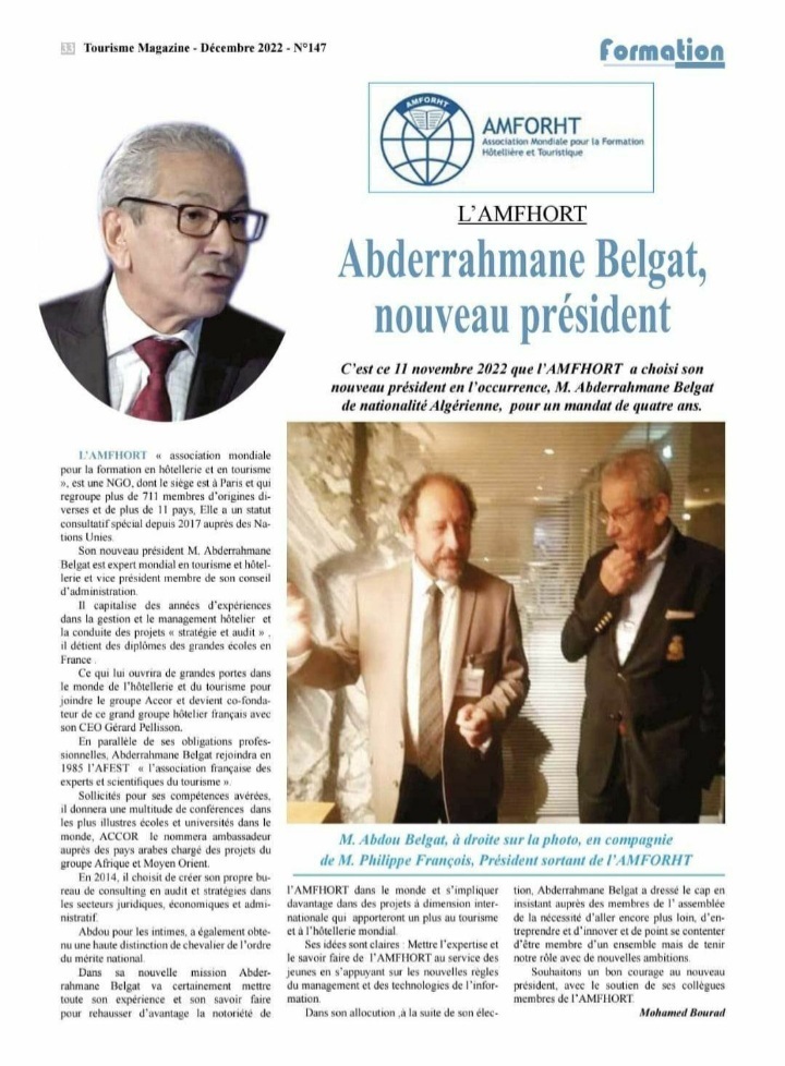 Lors de la dernière assemblée générale de l’Amfhort, qui s’est tenue le 11 novembre dernier à Paris,Abderahman Belgata été élu Président de l’association mondiale pour la formation en hôtellerie et en tourisme, pour les quatre ans à venir.