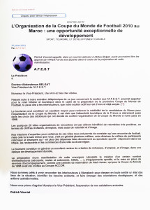 Ainsi, l’appui, exprimé officiellement, de l’AFEST au soutien de la candidature marocaine est considérable et se trouve être un élément non négligeable à saisir pour le Maroc. La conjugaison du tourisme et du sport roi, le Football en l’occurrence, est un facteur déterminant pour l’horizon 2010. Cette orientation devrait hisser le pays à un niveau plus élevé permettant à sa population de meilleures perspectives en matière d’emploi et de cadre de vie. Faut-il rappeler que ce sont là les grandes orientations officiellement exprimées et sérieusement mises en marche par SM le Roi Mohammed VI.